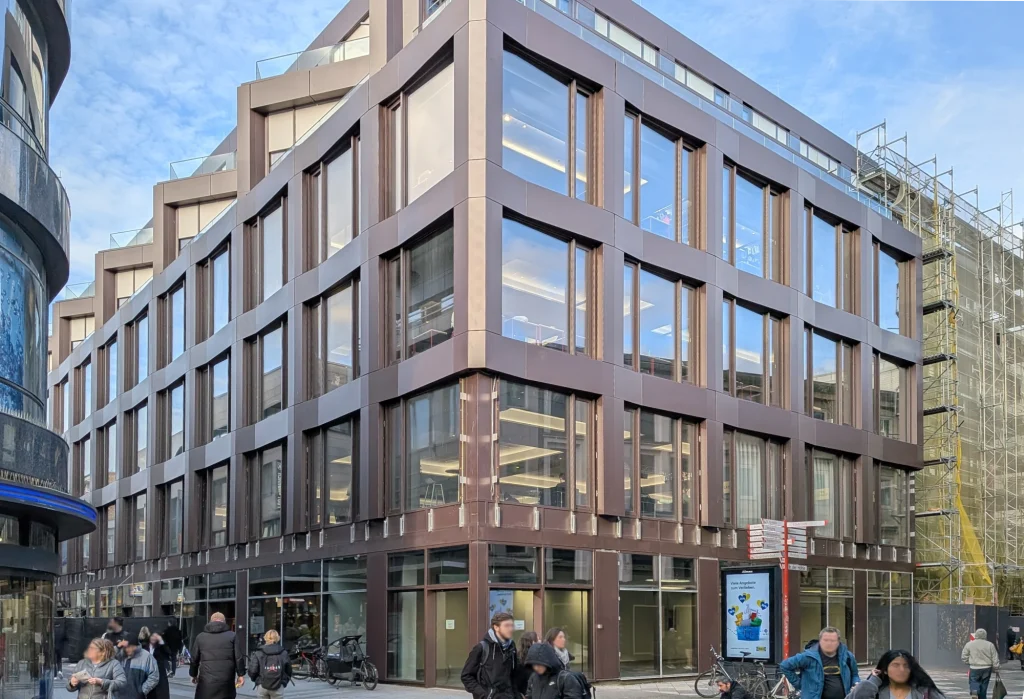 Der international renommierte Architekt Max Dudler hat dem ehemaligen Bestandsgebäude eine vollkommen neue Identität verliehen. Die ursprüngliche Fassade wurde vollumfänglich bis auf den Rohbau zurückgebaut und durch eine gefaltete Metall-Vorhangfassade mit Sonnenschutz ersetzt, die in Bronze schimmert und je nach Lichteinfall changiert. Das charakteristische Element bildet die namensgebende, gezackte Linie am Dach – eine architektonische Krone, die dem Gebäude seinen Namen gibt. Die gefaltete Struktur der Fassade schafft ein Spiel aus Licht und Schatten, während großzügige Verglasungen für Transparenz und Tageslicht sorgen.