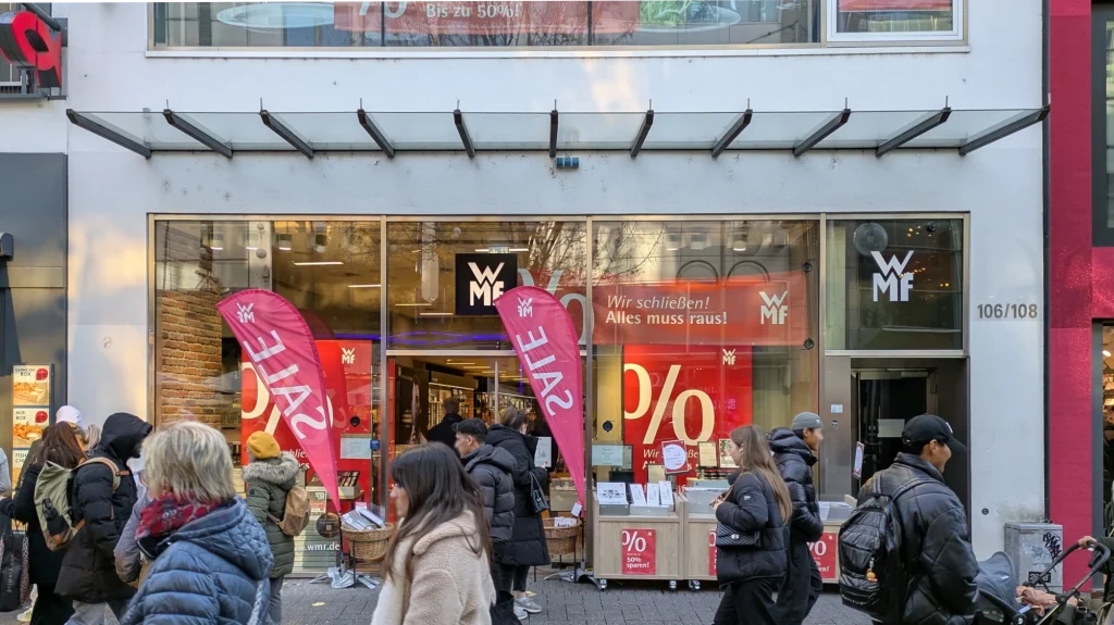 - WMF (Schildergasse 106-108): Der Abschied des Traditionsladens mit den ikonischen Bestecken und Profi-Kochtöpfen war absehbar, angekündigt und wurde mehrmals verschoben. Ende November 2025, nach über zehn Jahren, hat sich die Marke aus der Kölner Premium-Lage zurückgezogen.
